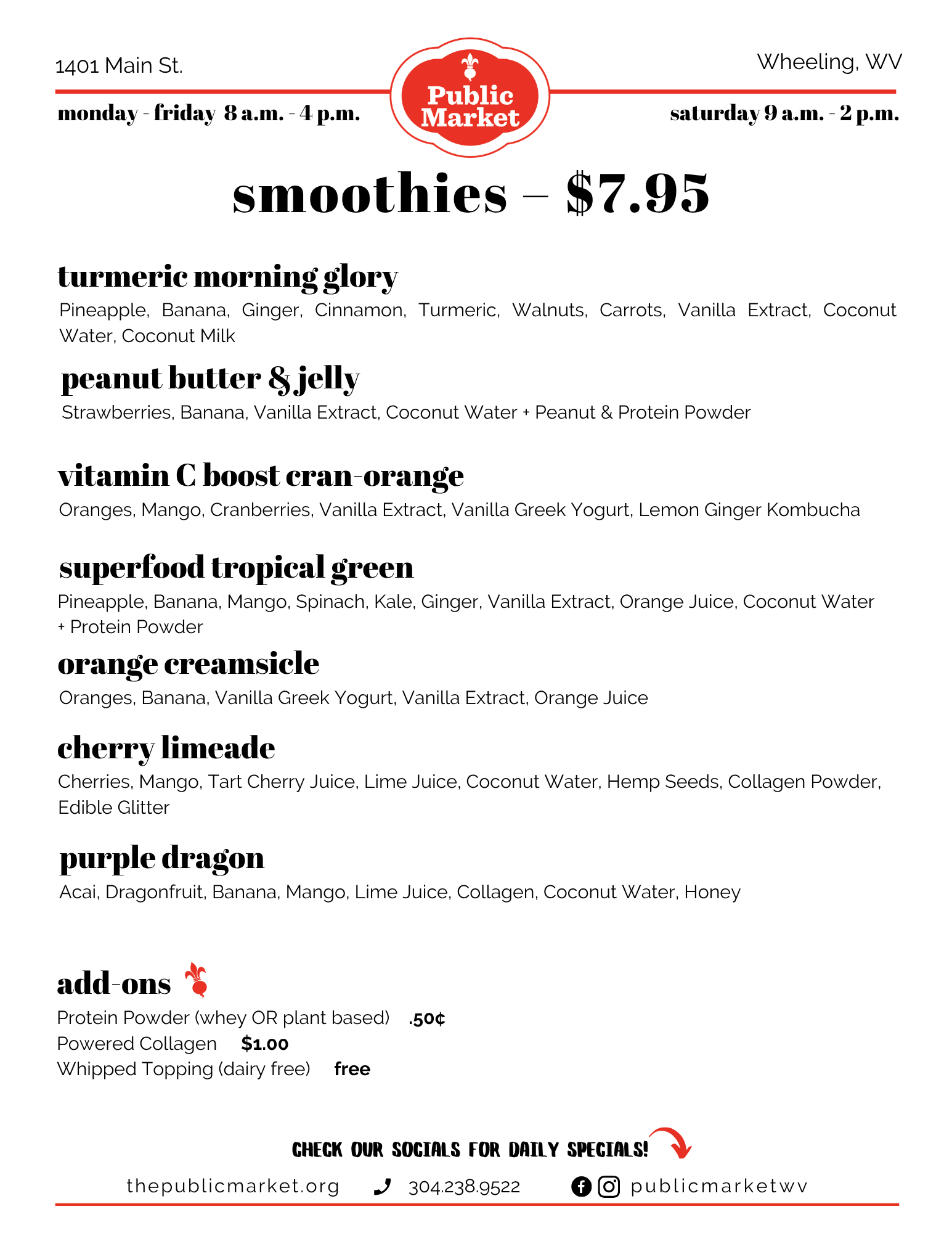 Check out our smoothie menu and join our Smoothie Lover Club. Pick up a punch card in store. Buy 10 Smoothies, get your 11th Free.